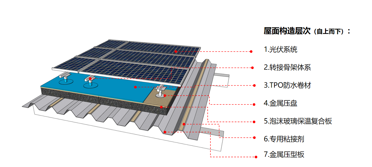 基層處理→粘貼保溫復(fù)合板→金屬壓盤錨固→粘貼高分子防水卷材→安裝光伏支架→安裝光伏板