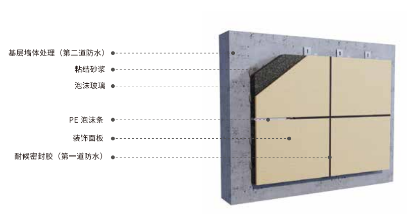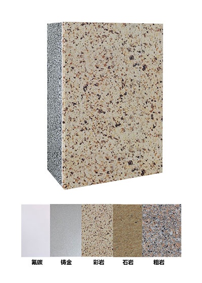 用底板和具有裝飾功能的面板分別和泡沫玻璃的兩面復(fù)合,面板具有豐富的裝飾效果,可選擇金屬復(fù)合板、柔性裝飾片/軟瓷、薄陶瓷;薄石材、厚型硅酸鈣板、薄型硅酸鈣板共計(jì)6種,為發(fā)揮泡沫玻璃的強(qiáng)度和剛度優(yōu)勢,主推前三種輕質(zhì)面板。